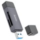 Преимущества: - Подключение 2-в-1: USB-A 3.0 + Type‑C для максимальной совместимости с устройствами - Два слота: TF (microSD) и SD в одном корпусе - Поддержка карт памяти объёмом до 2 TB - Высокая скорость передачи данных до 5 Gbps (теоретически) - Одновременное чтение и запись данных - Plug and Play — без установки драйверов - Компактный размер и малый вес, не перекрывает соседние порты - Защитные колпачки для обоих коннекторов, нескользящая фактура корпуса